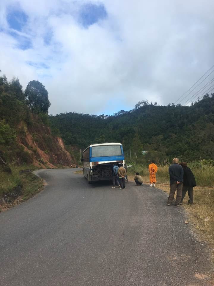 We soon left the city and entered a mountainous region. The traffic was very sparse and we hardly saw any vehicles.. The bus chugged on for the next few hours, stopping to pick up people or download them. Then all of sudden it came to a screeching halt. I thought we had arrived at our lunch spot but found that we were in the middle of nowhere (literally). The driver and his helper got off and began investigations into the fuel tank. Apparently there was a leakage and the tank has emptied. Now all the locals got off the bus and only the five foreigners remained. The locals had nicely settled by the roadside and started playing the radio on their mobile phones. So we were surrounded by different strains of Laotion music. Few people started a small picnic. The German couple came over to my seat to check if I knew how much time this would take. I decided to go and check with the driver. Armed with my brilliant sign language skills I asked how far we were from our destination? Is it 10 Km? He nodded yes! I was a little doubtful. So I said, it it 5 km? He nodded yes again. That is when I knew that my future as an interpreter was not very bright, While the foreigners were getting worried, the locals seemed to not have a care in the world. It seems that breakdowns are very common in Laos as most commercial vehicles are very poorly maintained,